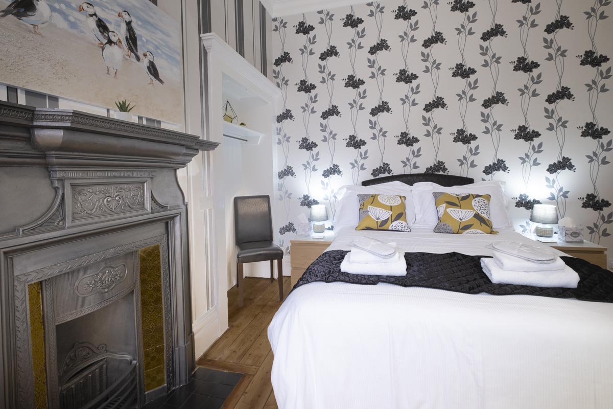 Room 2 –  A Super King room situated on the first floor. This room has recently been lovingly restored. It now boasts an original Victorian feature fireplace and wooden floor. We do not allow pets in this room. £95/Night